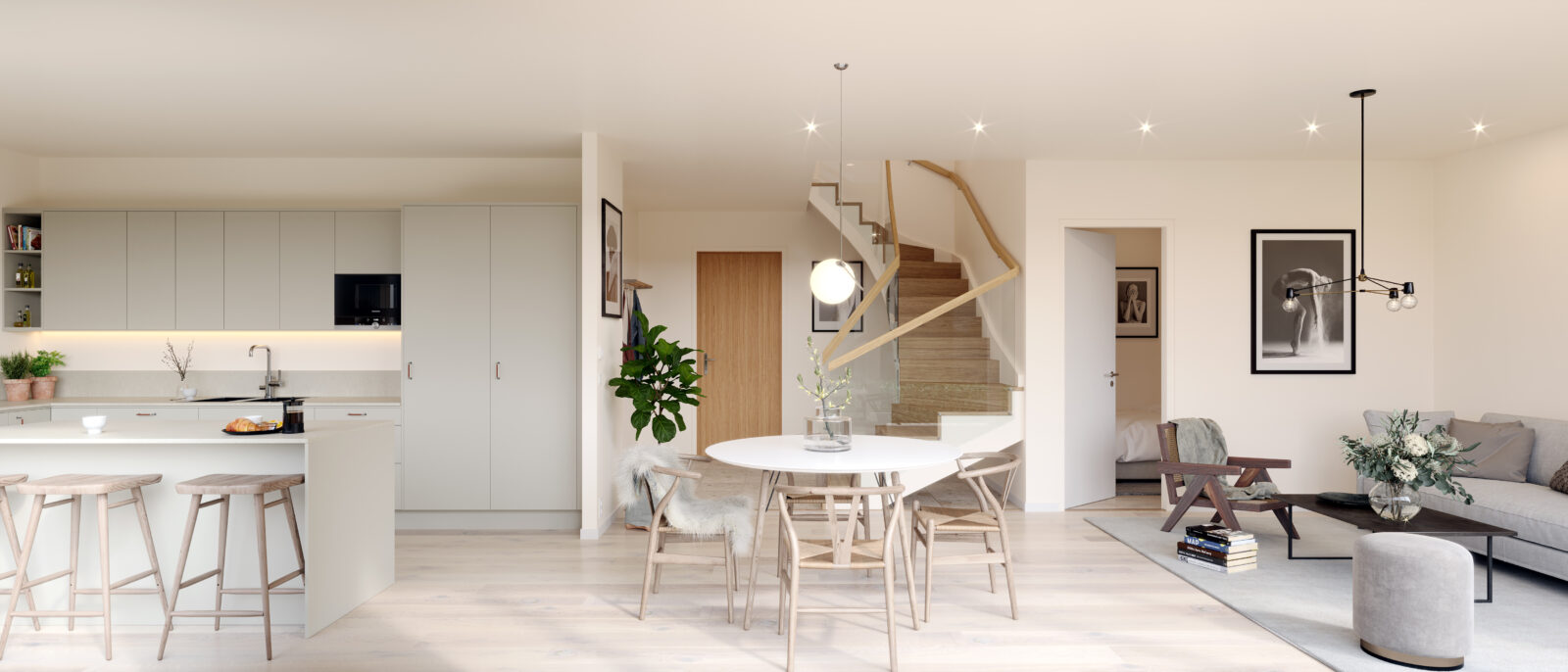Arkitekturen är modern med en tydlig dragning åt det klassiska hållet, vilket gör att husen smälter in naturligt i den gamla fina villamiljön. Varje parhus har öppen planlösning som underlättar för umgänge och ett levande hem.