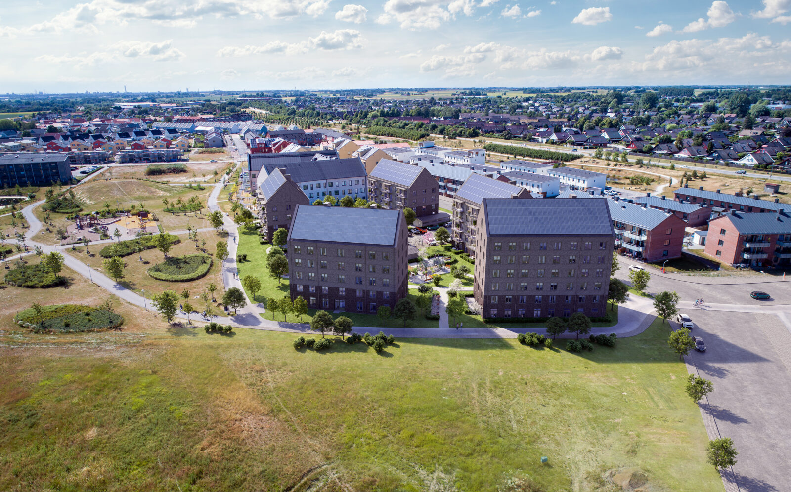I södra Staffanstorp växer stadsdelen Vikhem fram. Här bygger Resona för fem punkthus i tegel och puts som bildar ett kvarter med småstadskänsla.