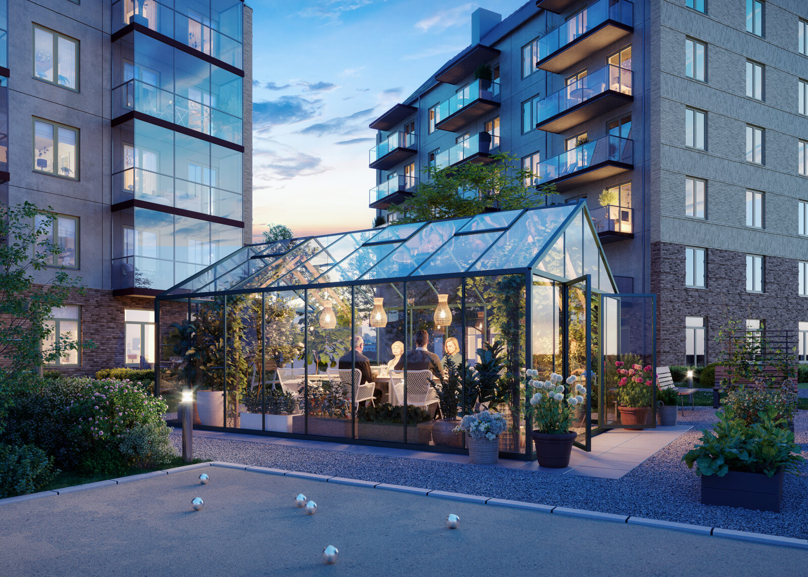 Lägenheterna blir rymliga och välplanerade och många får balkonger eller uteplatser. På den lummiga innergården finns möjlighet att grilla med vänner eller utmana familjen i ett parti boule. Det finns gott om parkering för både cykel och bil, och ett garage i direkt anslutning till husen.